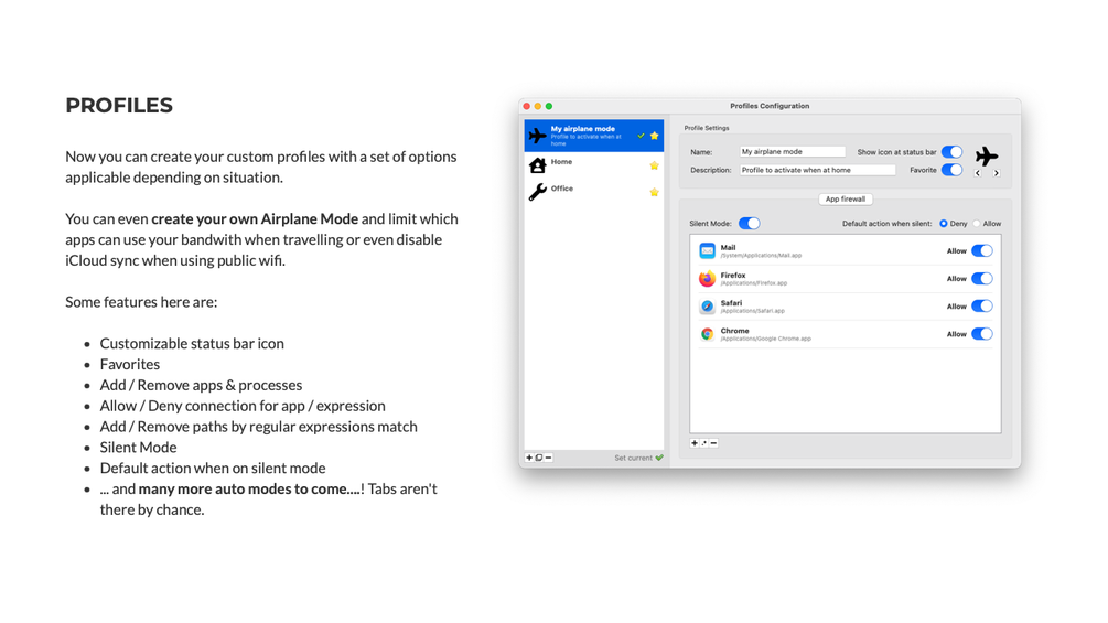 Bored like me of using too over complicated firewalls and only want to filter new connections for a set of apps depending on what you're doing? Then this app is for you!